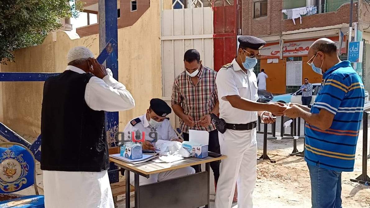 الشرطة توزع الكمامات على المواطنين بلجان انتخابات الشيوخ في مطروح | صور