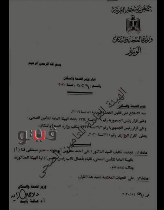 وزيرة الصحة تجدد لعلي محروس نائبا لرئيس التأمين الصحي عاما جديدا