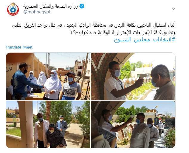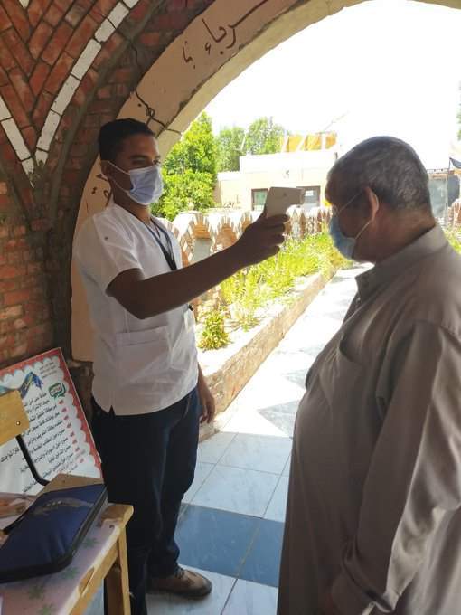 قامت وزارة الصحة، عبر حسابها الرسمي بتويتر، بنشر صور لاستقبال الناخبين بلجان بانتخابات مجلس الشيوخ في محافظة الوادي الجديد بالكشف عليهم بجهاز قياس الحرارة، في إطار الإجراءات الاحترازية الوقائية ضد الإصابة بفيروس كورونا المستجد كوفيد- 19.