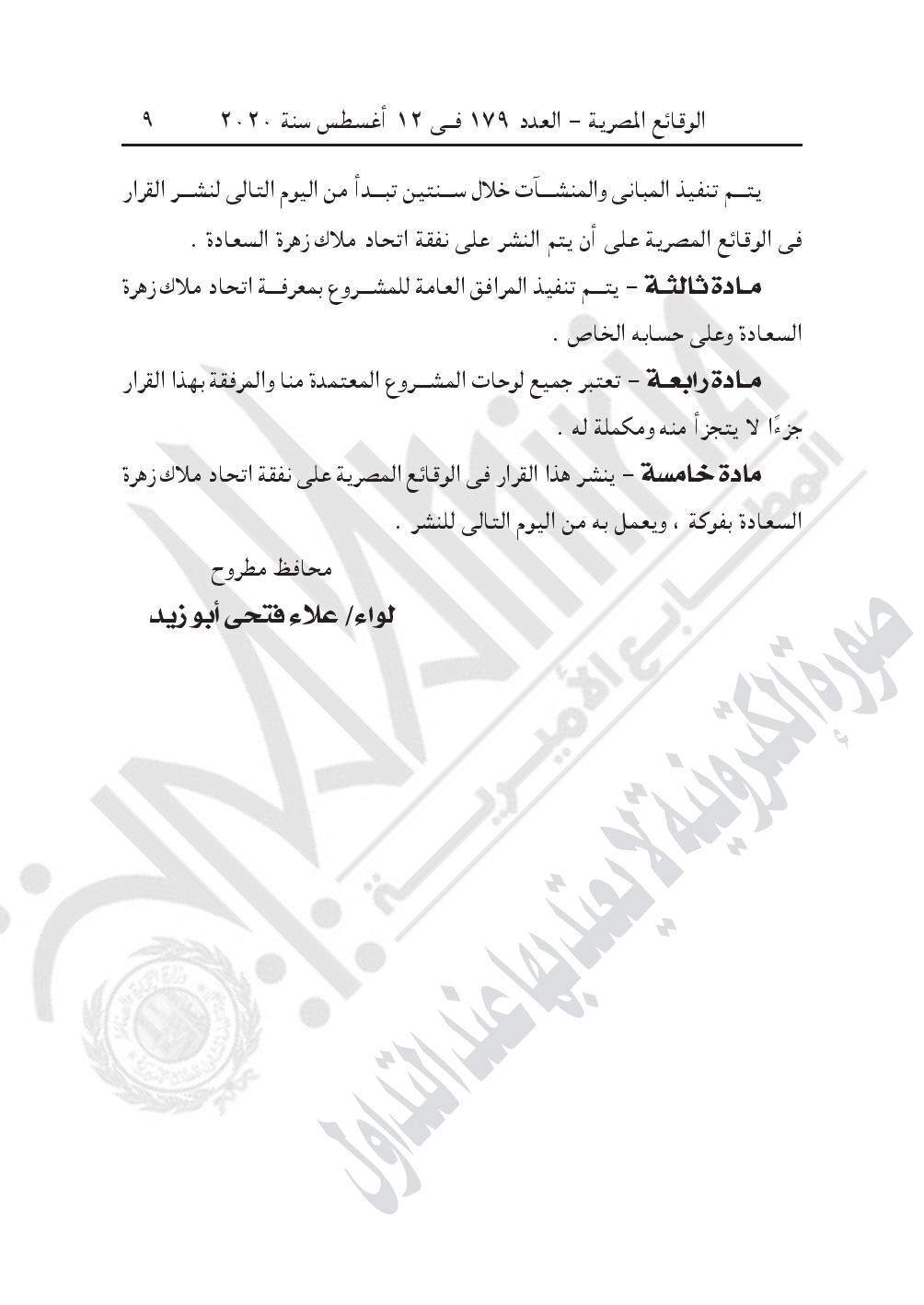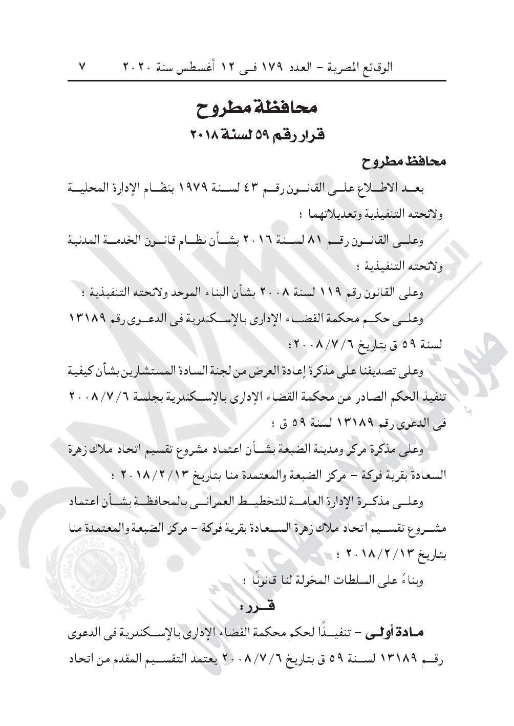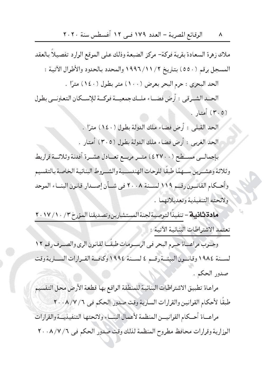 ونص القرار في مادته الأولى باعتماد التقسيم المقدم من اتحاد ملاك زهرة السعادة بقرية فوكة مركز الضبعة، تنفيذًا لحكم محكمة القضاء الإداري بالإسكندرية في الدعوى رقم 13189 لسنة 59 بتاريخ 6/8/2008 وذلك على الموقع الوارد تفصيلًا بالعقد المسجل برقم 550 بتاريخ 2/11/1996.