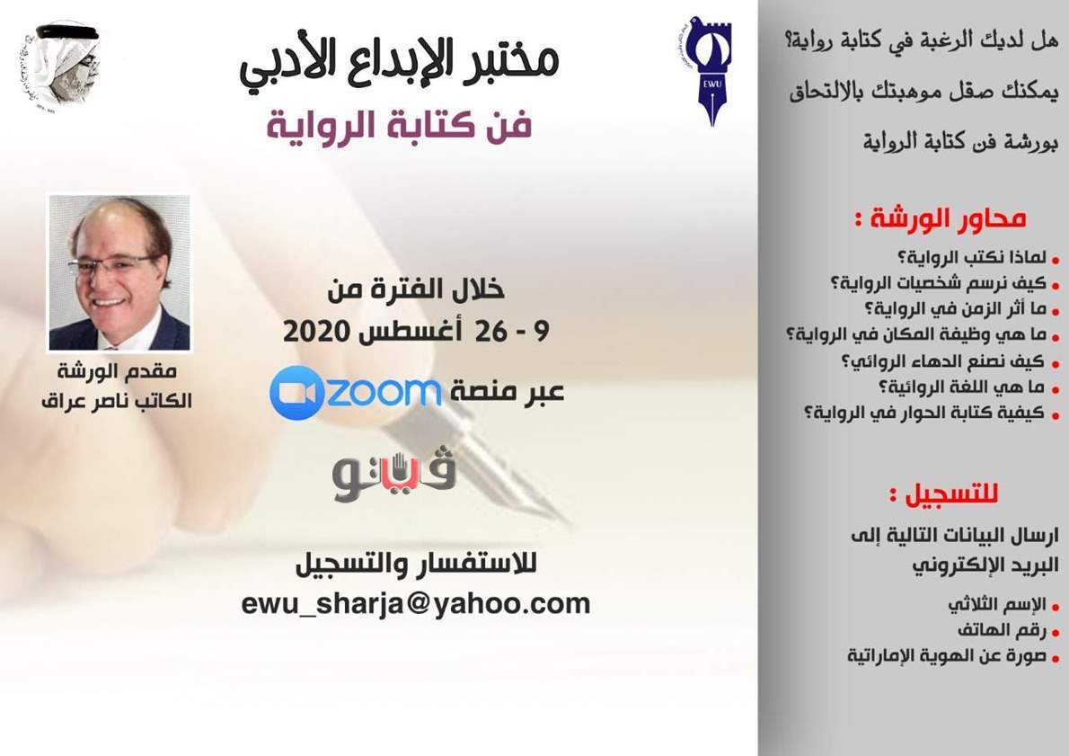يذكر أن يشارك الروائي المصري الكبير ناصر عراق في برنامج ثقافي إماراتي معنون بـ "مختبر الإبداع الأدبي" التابع لاتحاد كتاب وأدباء الإمارات، وذلك بداية من يوم الأحد الموافق 9 ويستمر حتى يوم 27 أغسطس الجاري، بهدف تزويد الكتاب الشباب بفنون الكتابة الإبداعية في مختلف المجالات الأدبية والارتقاء بالمستوى الثقافي والتقني للكتاب الشباب، كما يقدمها الروائي ناصر عراق عبر تطبيق " زووم " الإلكتروني.