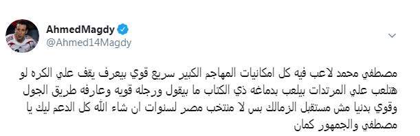 وكتب أحمد مجدي تغريدة على تويتر "مصطفي محمد لاعب فيه كل إمكانيات المهاجم الكبير سريع قوي بيعرف يقف علي الكرة لو هتلعب علي المرتدات بيلعب بدماغه ذي الكتاب ما بيقول ورجله قوية وعارفة طريق الجول وقوي بدنيا مش مستقبل الزمالك بس لا منتخب مصر لسنوات إن شاء الله كل الدعم ليك يا مصطفي والجمهور كمان"