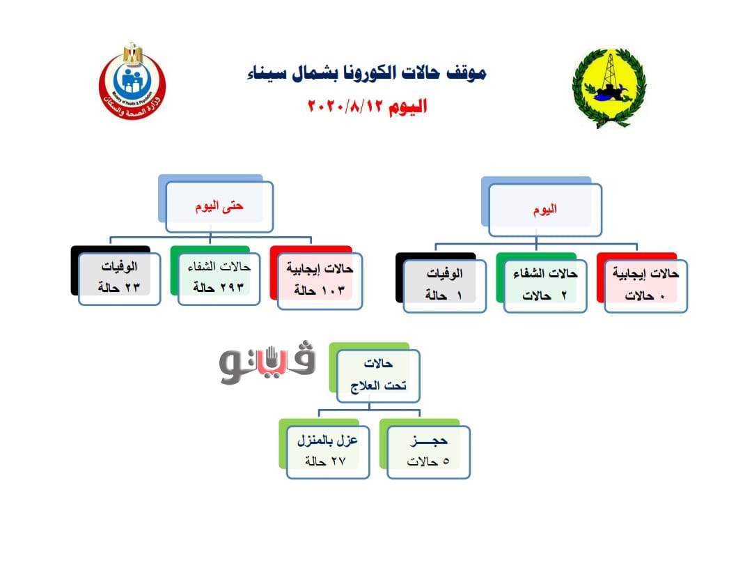 أعلنت مديرية الصحة بمحافظة شمال سيناء عن ارتفاع حالات الشفاء من مصابي فيروس كورونا لـ٢٩٣ حالة منذ تفشى الوباء ووفاة حالة جديدة لصبح الإجمالى ٢٣ حالة منذ تفشى الوباء.