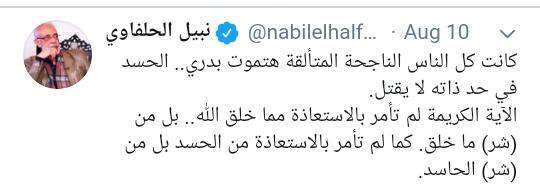 وعلق على ذلك الفنان نبيل الحلفاوي عبر حسابه الرسمي على موقع التدوينات القصيرة "تويتر" ,قائلا: "كانت كل الناس الناجحة المتألقة هتموت بدري .. الحسد في حد ذاته لا يقتل الآية الكريمة لم تأمر بالاستعاذة مما خلق الله بل من (شر) ما خلق كما لم تأمر بالاستعاذة من الحسد بل من (شر) الحاسد".
