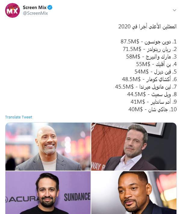 نشر موقع "Screen Mix"، المتخصص في أخبار المشاهير، قائمة للممثلين العالميين الأعلى أجرا في العالم عام 2020، وتصدر القائمة دوين جونسون بأجر بلغ 87.5 مليون دولار، يليه ريان رينولدز بمبلغ 71.5 مليون دولار، فيما جاء ويليام أدامز في المركز الثامن بمبلغ 44.5 مليون دولار وجاكي شان في المركز العاشر بمبلغ 40 مليون دولار.