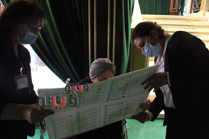مصطفي عميرة في مصر الجديدة على مساعدة إحدة السيدات المسنات في الإدلاء بصوتها بانتخابات مجلس الشيوخ، وذلك قبل غلق باب التصويت في ثاني أيام الانتخابات.