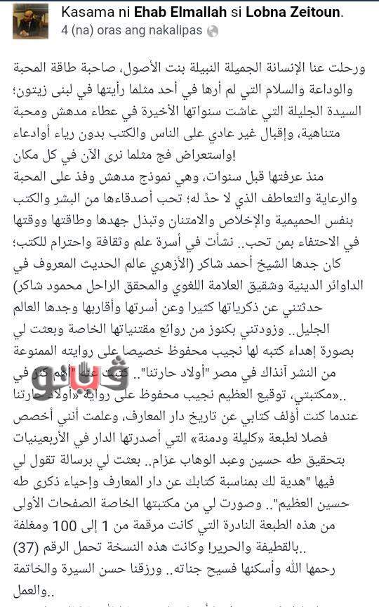 ونعت الدار المصرية اللبنانية رحيل القارئة لبنى زيتون عبر حسابها الرسمي على "فيس بوك" قائلة: "وفاة السيدة لبنى زيتون.. القارئة الجميلة التي أمضت حياتها في حب الكتب والقراءة".