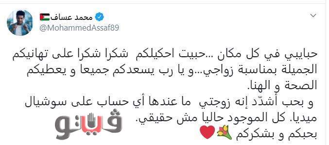 وكتب محمد عساف عبر تويتر قائلًا: "حبايبي في كل مكان.. حبيت أحكي لكم.. شكرًا على تهانيكم الجميلة بمناسبة زواجي.. ويا رب يسعدكم جميعًا ويعطيكم الصحة والهنا.. وبحب أشدِّد أن زوجتي ما عندها أي حساب على سوشيال ميديا.. كل الموجود حاليًا مش حقيقي.. بحبكم وبشكركم".