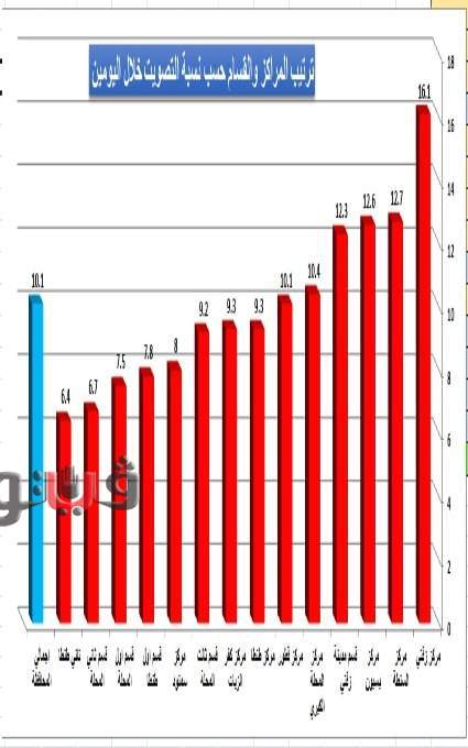 أما في مركز بسيون فشارك ٢٥٨٠٦ ناخبين بنسبة حضور ١٢.٦ % ومركز سمنود شارك ٢٠٥٩٨ ناخبا بنسبة حضور ٨ % ومركز قطور شارك ٢٤١٢٩ ناخبا بنسبة حضور ١٠.١% ومركز كفر الزيات شارك ٣٠١١٩ ناخبا بنسبة حضور ٩.٣ %.