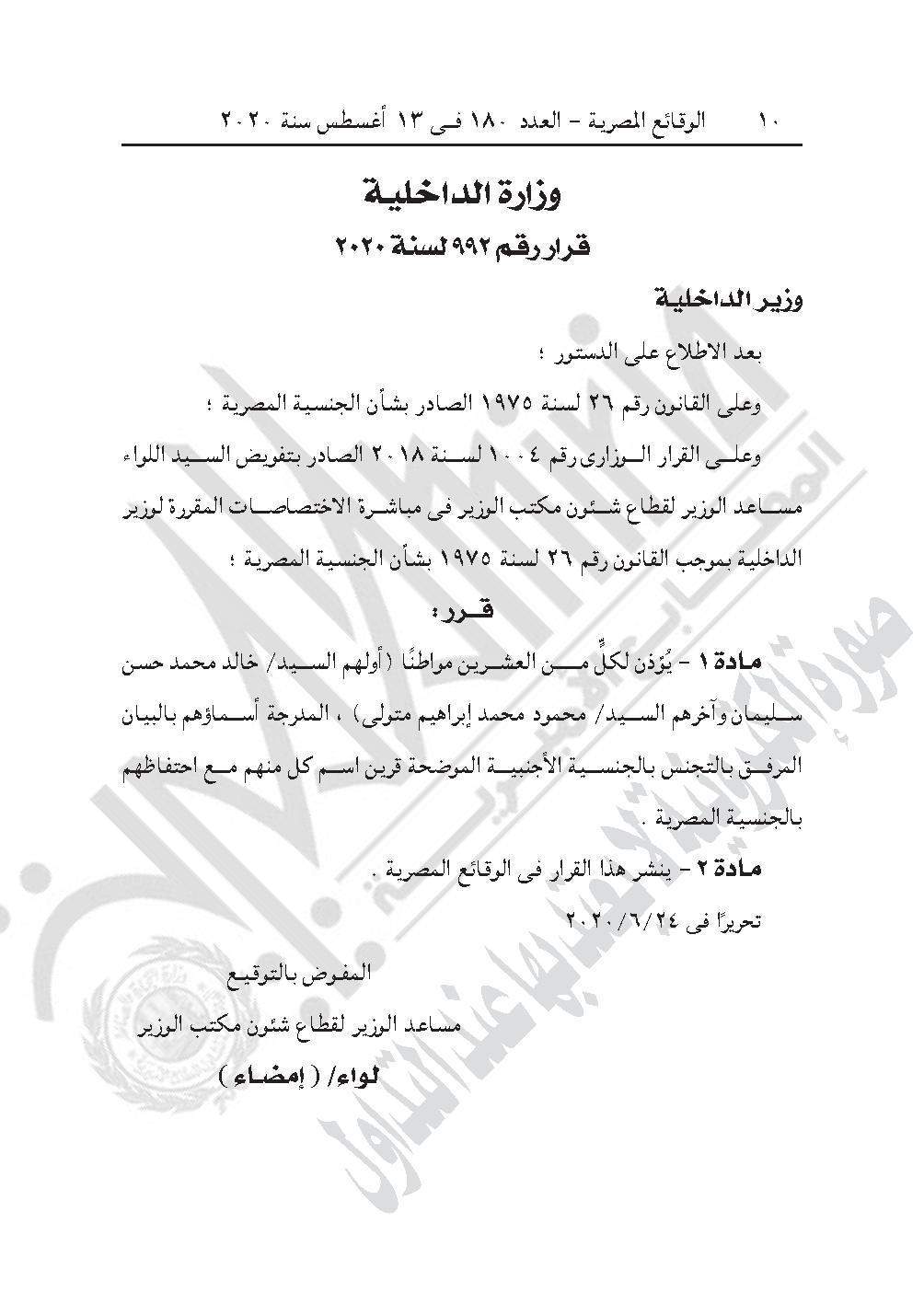 وتضمن القرار رقم 992 لسنة 2020، الإذن لكل من العشرين مواطنًا (أولهم خالد محمد حسن سليمان وآخرهم محمود محمد إبراهيم متولى)، المدرجة أسماؤهم بالبيان بالتجنس بالجنسية الأجنبية قرين اسم كل منهم مع احتفاظهم بالجنسية المصرية.