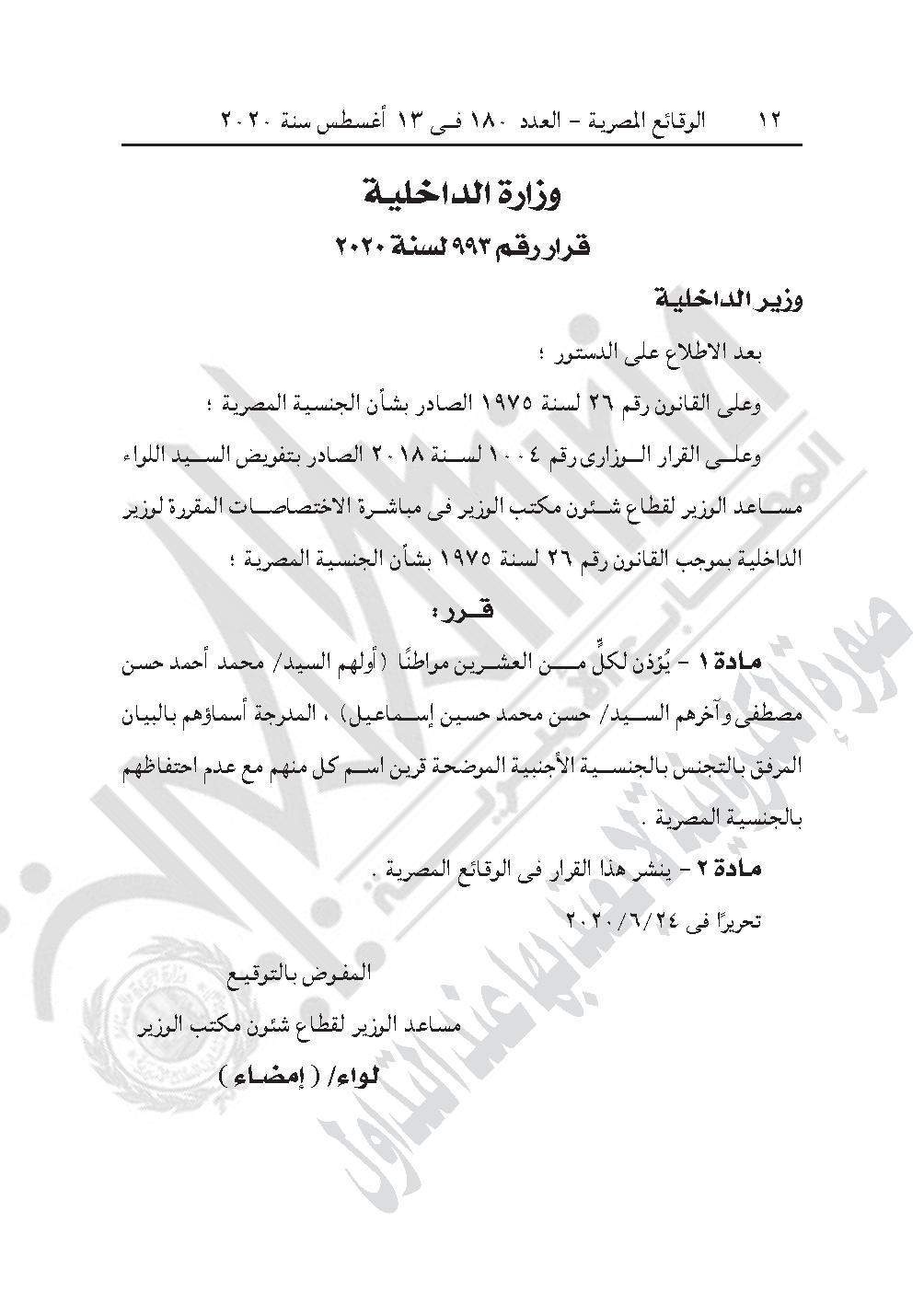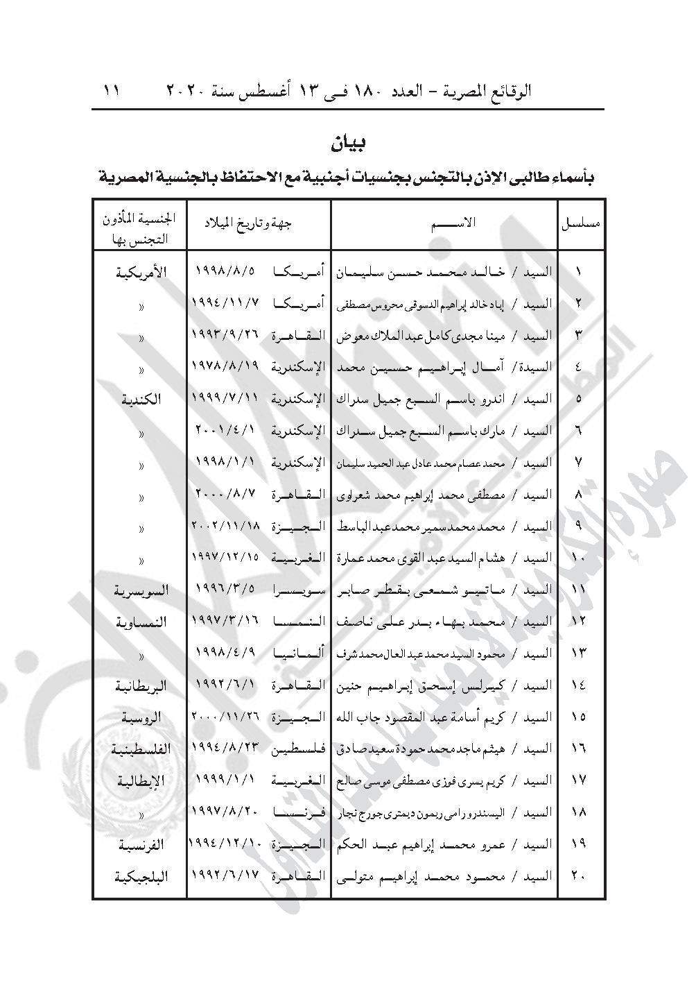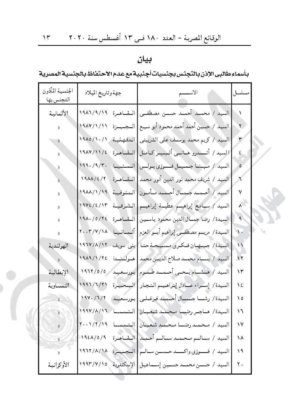 نشرت جريدة الوقائع المصرية في عددها رقم 180، الصادر في 13 أغسطس 2020، قرارا وزارة الداخلية بشأن الإذن لـ 20 مواطنًا التجنس بالجنسية الاجنبية وسحب الجنسية المصرية من 20 آخرين.