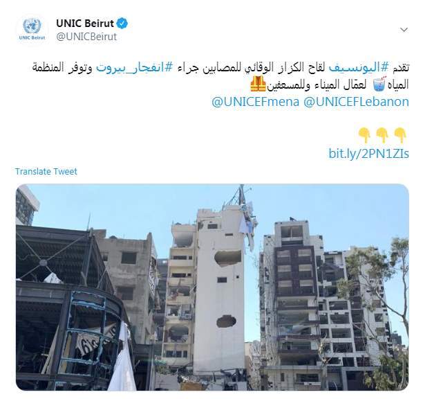قالت ماركسي ميركادو، الناطقة باسم منظمة الأمم المتحدة للطفولة (أوتشا) عبر صفحة اليونيسف بالإنترنت، إن اليونيسيف تقدم لقاح الكزاز الوقائي للمصابين في بيروت، ووصلت هذه اللقاحات إلى لبنان يوم الجمعة 7 أغسطس الماضي.
