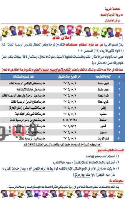 أعلنت مديرية التربية والتعليم بمحافظة الغربية اليوم الخميس عن مد فترة استلام مستندات المتقدمين لمرحلة رياض الأطفال بالمدارس الرسمية "للغات" لمدة (٧) أيام تنتهى الأربعاء (19) أغسطس ٢٠٢٠.