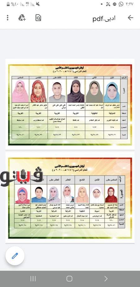 الثاني: أسماء عبدالله محمد عبدالله، الدقهلية، فتيات كفر المقدام، ٩٨,٨٩٪.