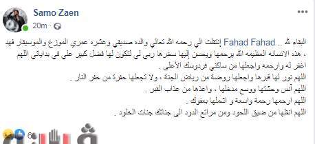 قدم المطرب السوري سامو زين العزاء لصديقه الموزع فهد في وفاة والدته عبر صفحته الشخصية علي موقع التواصل الاجتماعي "فيس بوك".