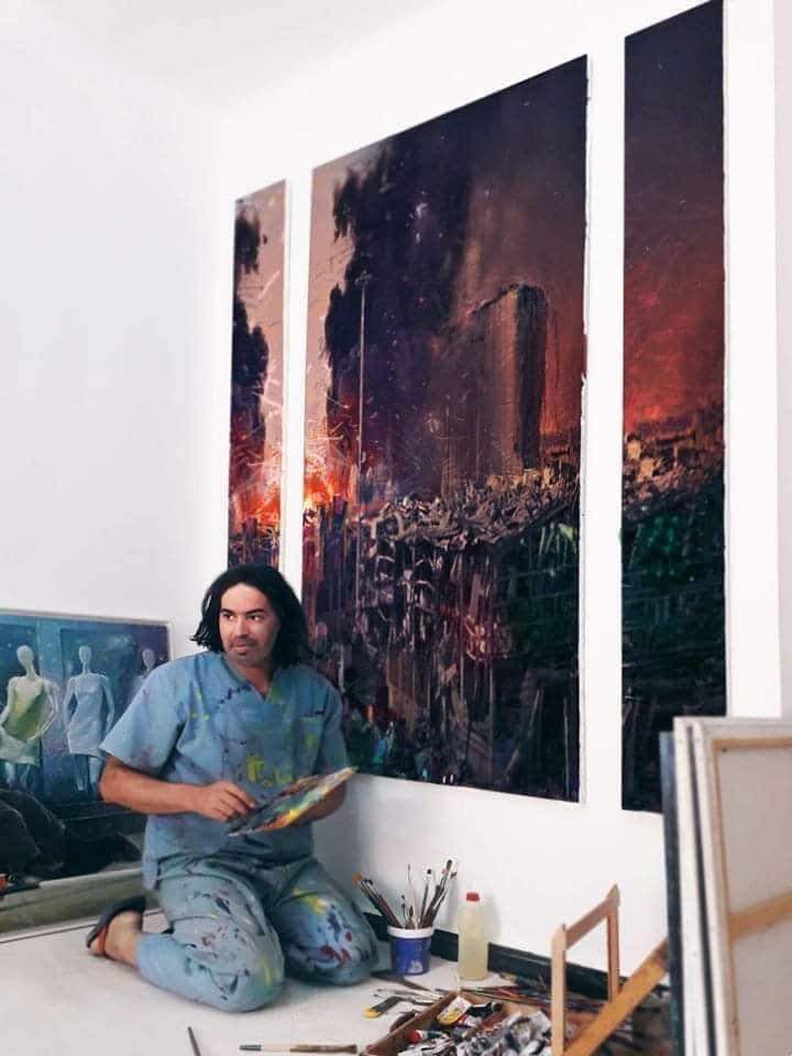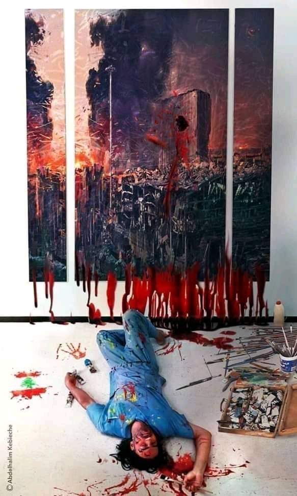 وقدم الفنان الجزائري عبد الحيلم كبيش لوحة "شظايا بيروت" مغطة باللون الأحمر مصورًا الضحايا الأبرياء والمصابين بحريق مرفأ بيروت، كما صور باللوحة مشاعره فرقد بجانب اللوحة في وضعية القتيل المغطى بلون الدم.
