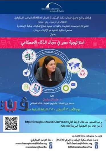 يقدم قطاع المكتبات بمكتبة الإسكندرية محاضرة عبر الانترنت بعنوان "استراتيجية مصر في مجال الذكاء الاصطناعي"، تلقيها الدكتورة جلستان رضوان مستشار وزير الاتصالات وتكنولوجيا المعلومات للذكاء الاصطناعي، وذلك الساعة السابعة مساء الأحد 16 أغسطس.