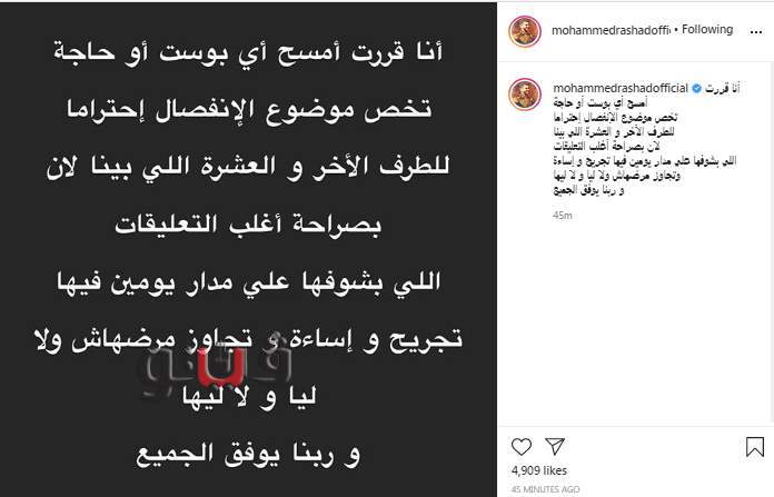 وكتب رشاد: «أنا قررت أمسح أي بوست أو حاجة تخص موضوع الإنفصال إحتراما للطرف الآخر والعشرة اللي بيننا لان بصراحة أغلب التعليقات اللي بشوفها علي مدار يومين فيها تجريح وإساءة وتجاوز مرضهاش ولا ليا و لا ليها وربنا يوفق الجميع».