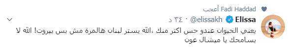وعبّرت إليسا عن غضبها من السلطات الحاكمة وخاصةً الرئيس، من خلال حسابها الشخصي على موقع التدوينات القصيرة “تويتر”، وكتبت: “يعني الحيوان عندو حس أكتر منك، الله يستر لبنان هالمرة مش بس بيروت.. الله لا يسامحك يا ميشال عون”.