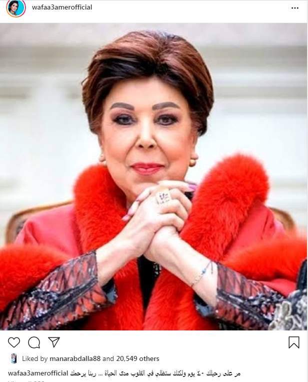 أحيت الفنانة وفاء عامر عبر حسابها الشخصي على موقع الصور الشهير "انستجرام"، ذكرى مرور 40 يوما على وفاة الفنانة الراحلة رجاء الجداوي.