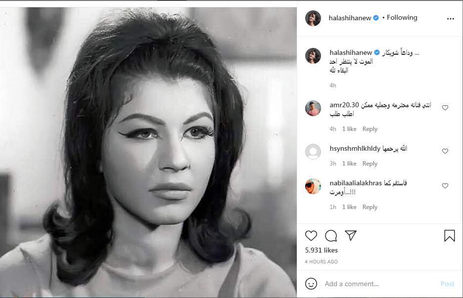 نعت الفنانة حلا شيحة عبر حسابها الشخصي على