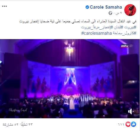 طلبت النجمة اللبنانية كارول سماحة عبر صفحتها الشخصية على موقع التواصل الاجتماعي "فيس بوك"، من جمهورها الصلاة على ضحايا انفجار مرفأ بيروت، والذي وقع في 4 أغسطس الجاري، بالعاصمة اللبنانية.