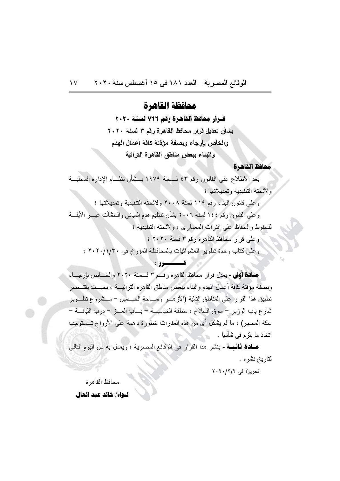 نشرت جريدة "الوقائع المصرية" في عددها رقم 181، الصادر في 15 أغسطس 2020، قرار محافظة القاهرة رقم 766 لسنة 2020، بشأن تعديل قرار محافظة القاهرة رقم 3 لسنة 2020 والخاص بإرجاء وبصفة مؤقتة كافة أعمال الهدم والبناء ببعض مناطق القاهرة التراثية.