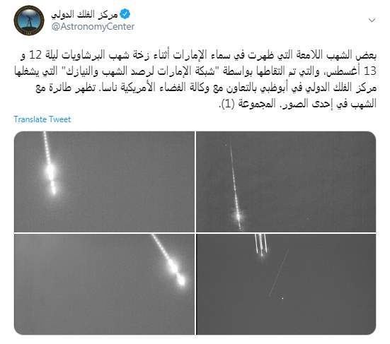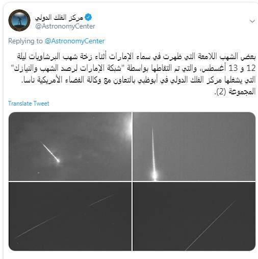 وكتب مرصد الفلك الدولى تغريدة على تويتر "بعض الشهب اللامعة التي ظهرت في سماء الإمارات أثناء زخة شهب البرشاويات ليلة 12 و 13 أغسطس، والتي تم التقاطها بواسطة "شبكة الإمارات لرصد الشهب والنيازك" التي يشغلها مركز الفلك الدولي في أبوظبي بالتعاون مع وكالة الفضاء الأمريكية ناسا. تظهر طائرة مع الشهب في إحدى الصور. المجموعة (1)