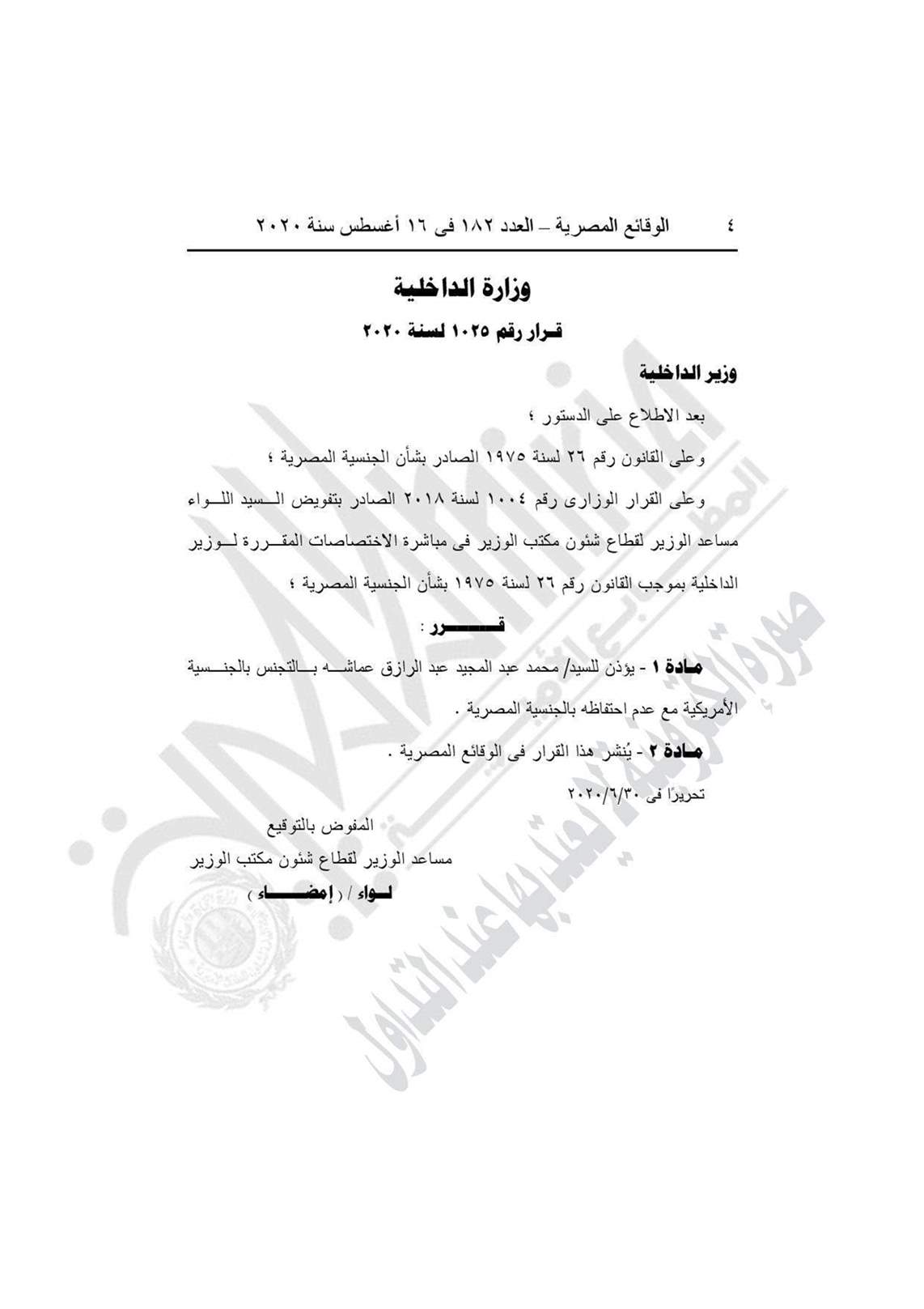 وحمل القرار الثاني رقم 1025 لسنة 2020، بالأذن بـ محمد عبد المجيد عبد الرازق عماشة بالتجنس بالجنسية الأمريكية مع عدم احتفاظه بالجنسية المصرية.