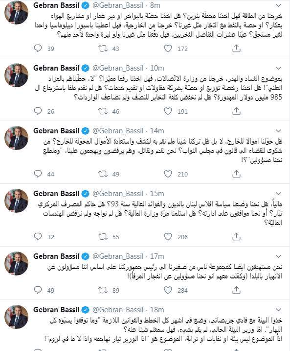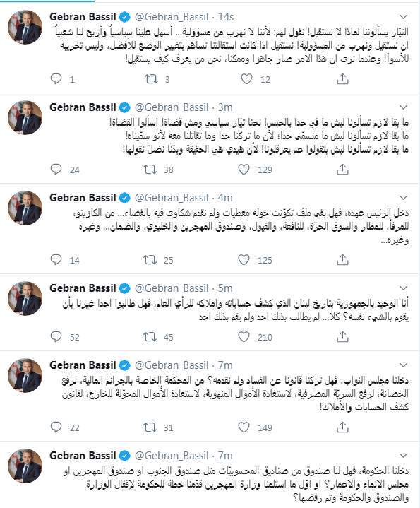 برر جبران باسيل، وزير خارجية لبنان السابق ورئيس التيار الوطني الحر، ما يواجهه لبنان من أزمات على الصعيد الاقتصادي والسياسي والاجتماعي بأن لبنان مستهدف، وطالب بأن يكون جميع المسئولين والسياسيين والوزراء تحت طائلة القانون.