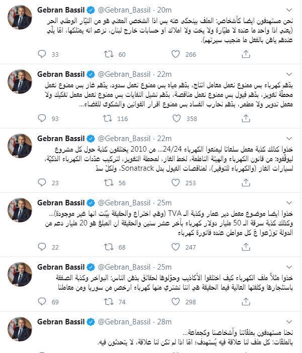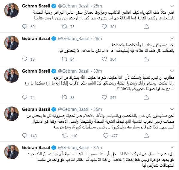 ووصف من ينتقدون الرئيس اللبناني ميشال عون بأنهم سماسرة الاستغلال السياسي وأبواق الحقد الإعلامي، لتصوير السياسيين اللبنانيين بالمجرمين المباشرين، بحسب باسيل، رافضًا إخراج حزب الله الشيعي من المعادلة اللبنانية.