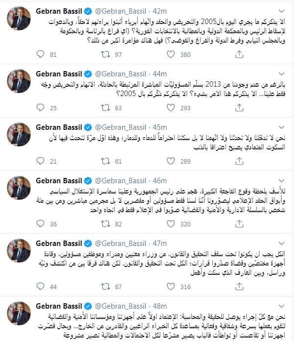وكتب جبران باسيل تغريدة على تويتر: "الكل يجب ان يكونوا تحت سقف التحقيق والقانون، من وزراء معنيين ومدراء وموظفين مسؤولين، وقادة أجهزة مختصّين وقضاة صدّروا قرارات؛ الكل تحت التحقيق والقانون. لكن هناك فرقا بين من اكتشف ونبّه وراسل، وبين العارف الذي سكت وأهمل".