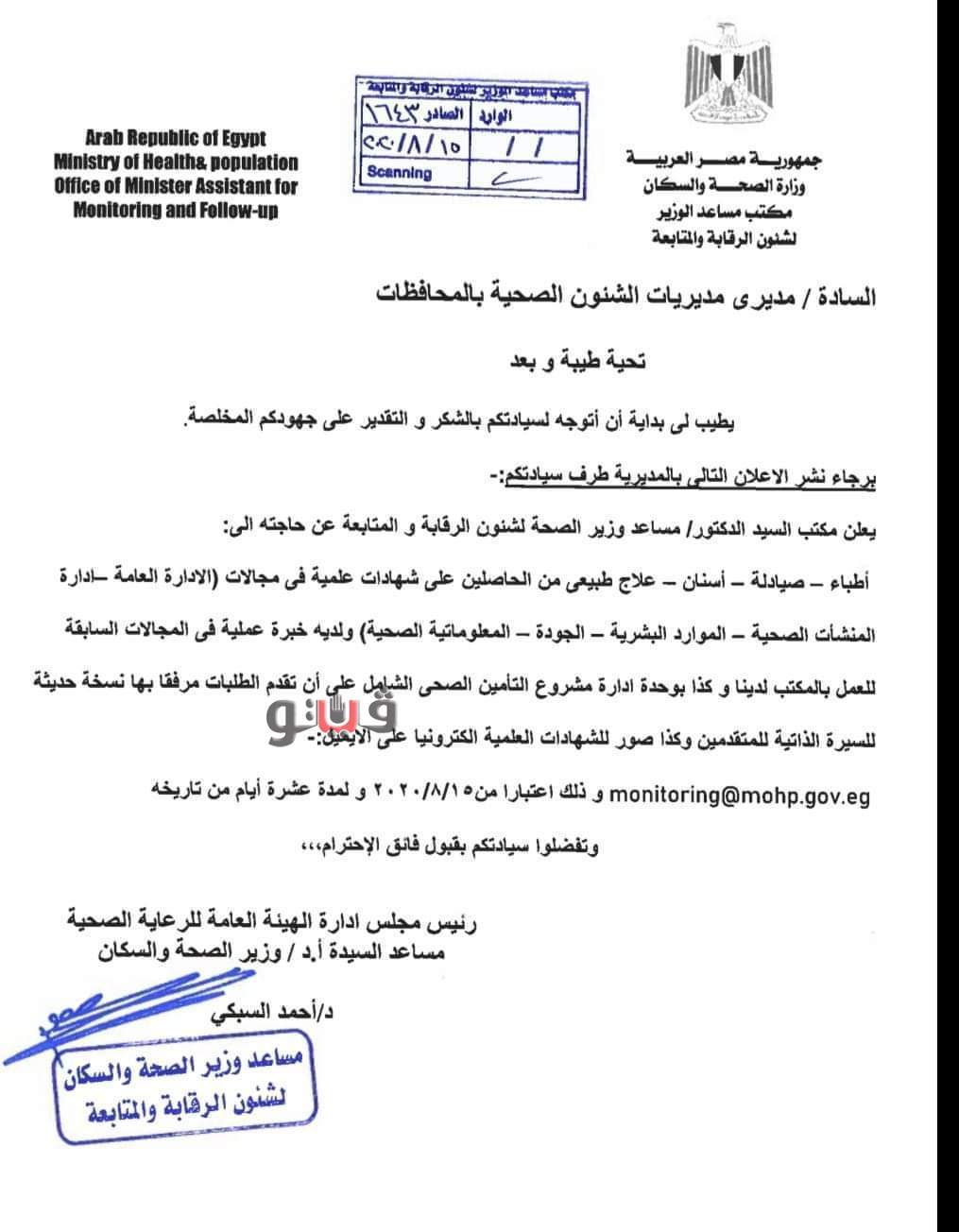 أصدر الدكتور أحمد السبكي مساعد وزير الصحة للرقابة والمتابعة خطابا إلى مديريات الشئون الصحية بالمحافظات، بشأن الإعلان عن حاجة قطاع شؤون الرقابة والمتابعة إلى أطباء بشريين وصيادلة وأطباء أسنان وتخصص علاج طبيعي من الحاصلين على شهادة علمية في مجالات الإدارة العامة وإدارة المنشآت الصحية والموارد البشرية والجودة والمعلومات الصحية ولديه خبرة عملية في المجالات السابقة العمل بالمكتب وكذلك وحدة إدارة مشروع التأمين الصحي الشامل.