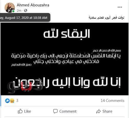 وأعلن أحمد أبو زهرة نجل الفنان عبد الرحمن أبو زهرة وفاة عمته عبر حسابه الشخصى بموقع التواصل الاجتماعى "فيس بوك" قائلًا: "توفيت فجر اليوم عمتى سعدية".