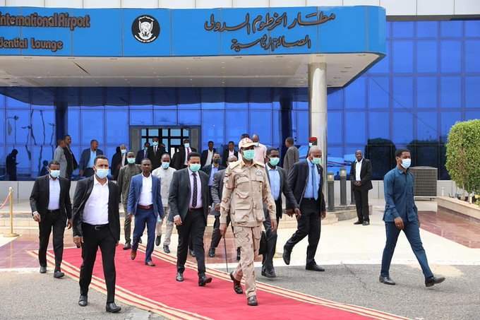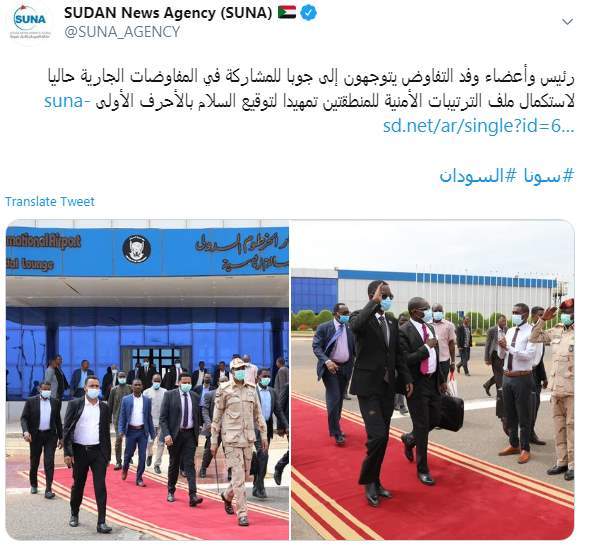 أكدت وكالة الأنباء السودانية (سونا)، عبر حسابها الرسمية بتويتر، على توجه النائب الأول لرئيس مجلس السيادة الإنتقالي رئيس وفد التفاوض الفريق أول محمد حمدان دقلو، اليوم الاثنين، إلى جوبا للمشاركة في المفاوضات الجارية حاليًا، لاستكمال ملف الترتيبات الأمنية للمنطقتين تمهيدًا لتوقيع السلام بالأحرف الأولى .