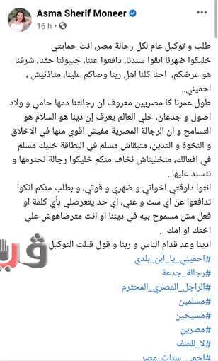 وتابعت أسما : "طول عمرنا كمصريين معروف إن رجالتنا دمها حامي وولاد أصول وجدعان، خلي العالم يعرف إن دينا هو السلام هو التسامح وإن الرجالة المصرية مفيش أقوى منها في الأخلاق والنخوة والتدين، متبقاش مسلم في البطاقة خليك مسلم في افعالك، متخليناش نخاف منكم خليكوا رجالة نحترمها ونتسند عليها".
