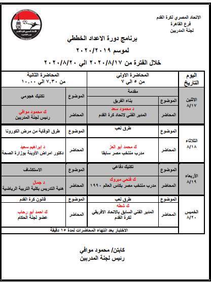 وتقام دورة الإعداد الخططي للمدربين استكمالا لبرنامج الدورات المتخصصة والتي تنظمها منطقة القاهرة ومتابعة تنفيذية من لجنة المدربين بالمنطقة بقيادة محمود موافي وأعضاء اللجنة ومحمد طه مقرر اللجنة وتحت إشراف اللجنة الفنية باتحاد الكرة برئاسة الدكتور محمود سعد.
