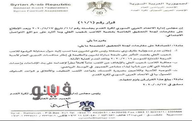 وكان الاتحاد السوري قام في شهر يونيو الماضي استدعاء مدافع الطليعة شعيب العلي للتحقيق معه بشأن تصريحاته التي اتهم فيها أحد المقربين من نادي تشرين بمحاولة رشوته.