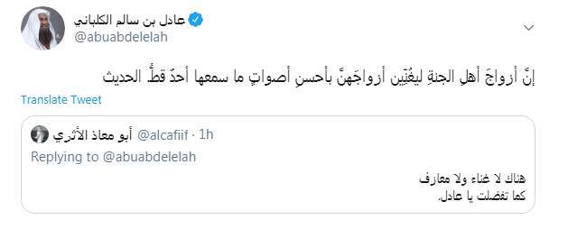 ليرد عليه أبو معاذ الأثري " هناك لا غناء ولا معازف كما تفضلت يا عادل".