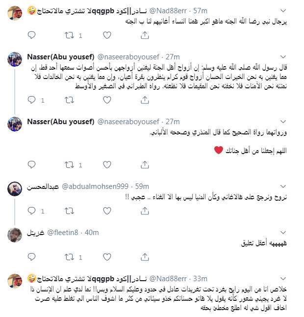 وقال نادر كود "يرجال نبي رضا الله الجنه ماهو اكبر همنا النساء أغانيهم لنا ب الجنه"
