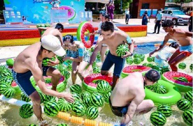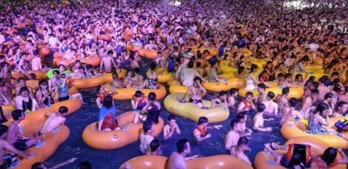 المواطنين بمنتزه "ووهان بيتش" المائي، الذي امتلأ عن آخره بالمحتفلين