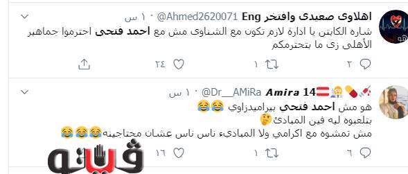 تصدر أحمد فتحي لاعب الأهلي، موقع التدوينات القصيرة "تويتر"، بعد منحه شارة قيادة المارد الأحمر أمام أسوان ضمن منافسات الجولة الـ20 بمسابقة الدوري الممتاز على أرضية استاد القاهرة الدولي .