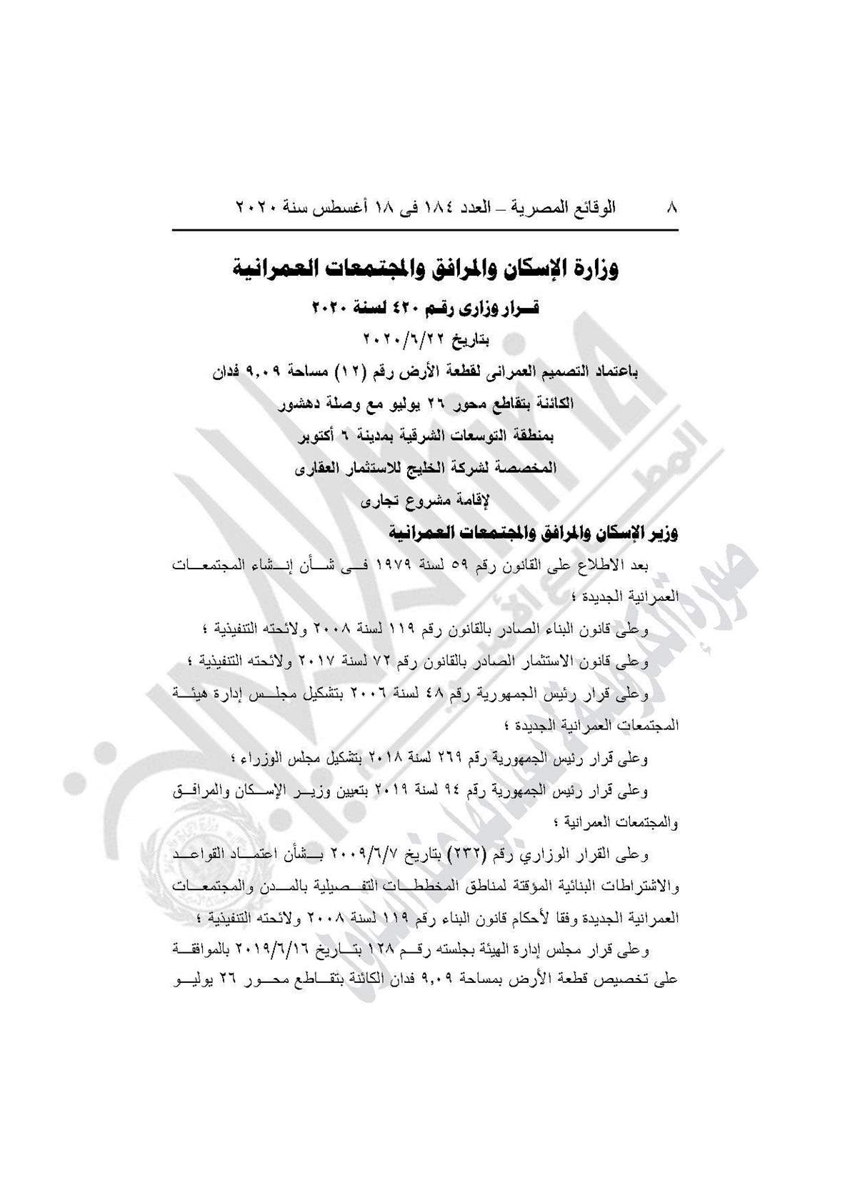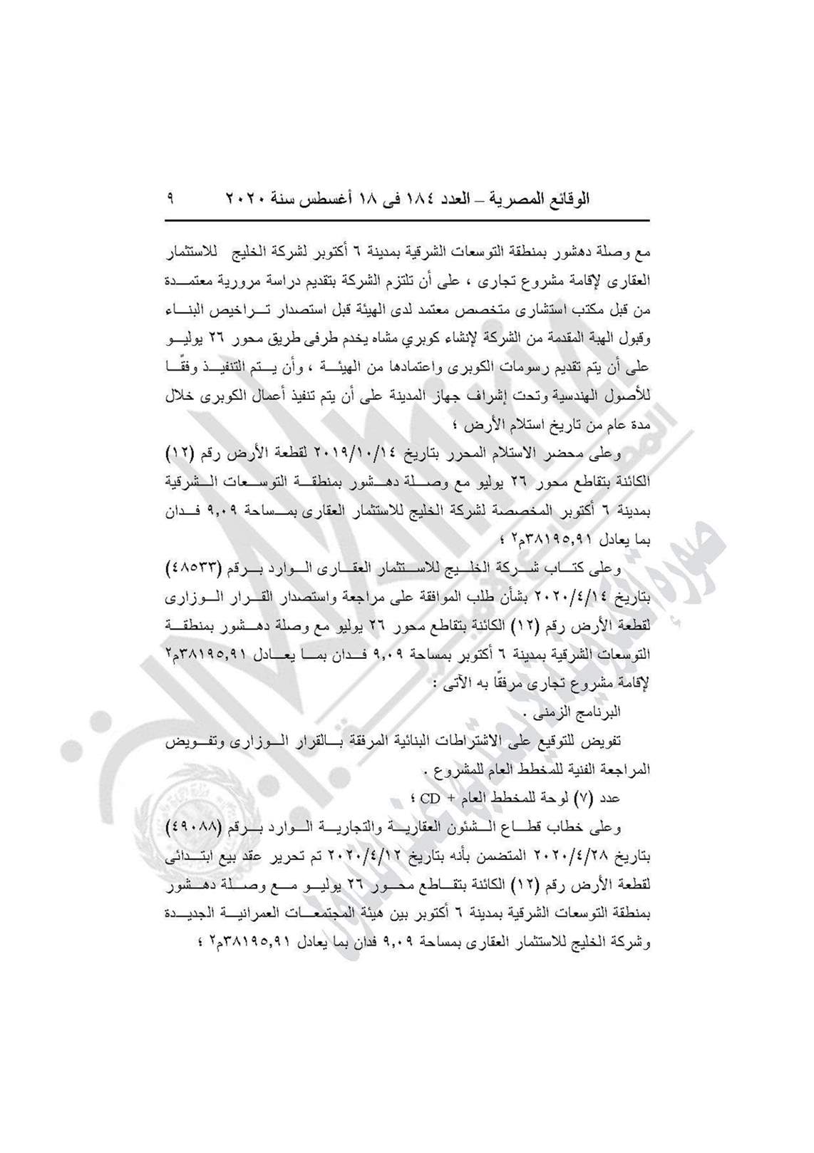 نشرت جريدة الوقائع المصرية في عددها رقم 184، الصادر في 18 أغسطس 2020، قرار وزارة الإسكان والمرافق والمجتمعات العمرانية رقم 420 لسنة 2020، باعتماد التصميم العمراني لقطعة الأرض 12 مساحة 9.09 فدان الكائنة بتقاطع محور 26 يوليو مع وصلة دهشور بمنطقة التوسعات الشرقية بمدينة 6 أكتوبر المخصصة لشركة الخليج للاستثمار العقاري لإقامة مشروع تجاري.
