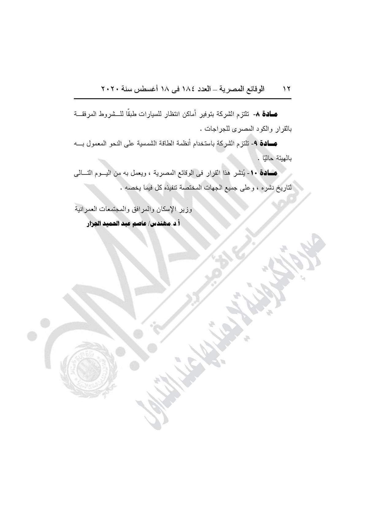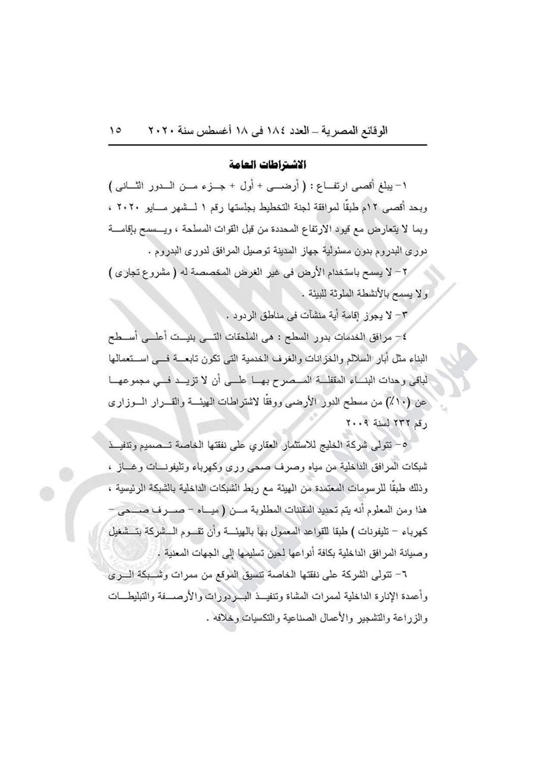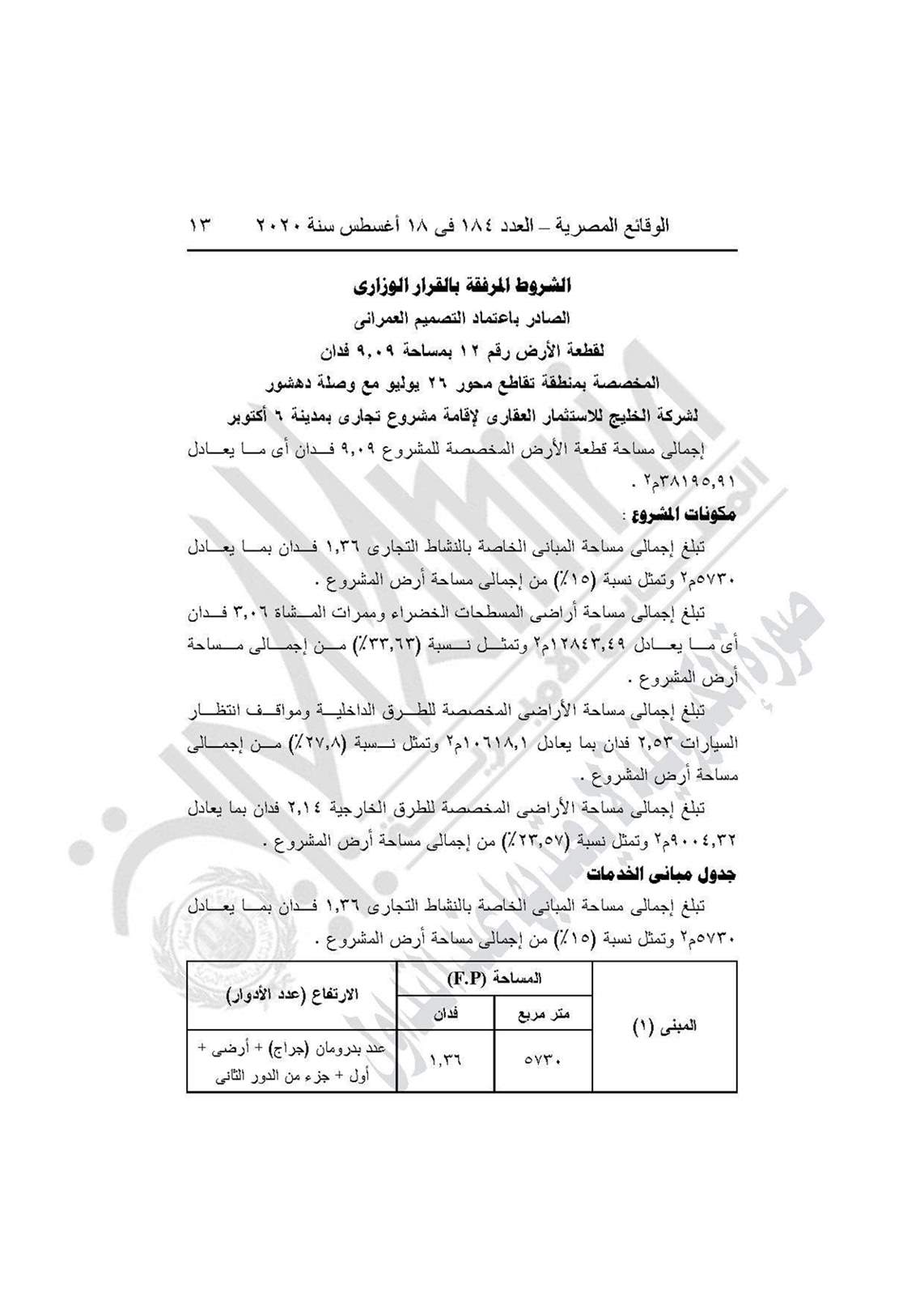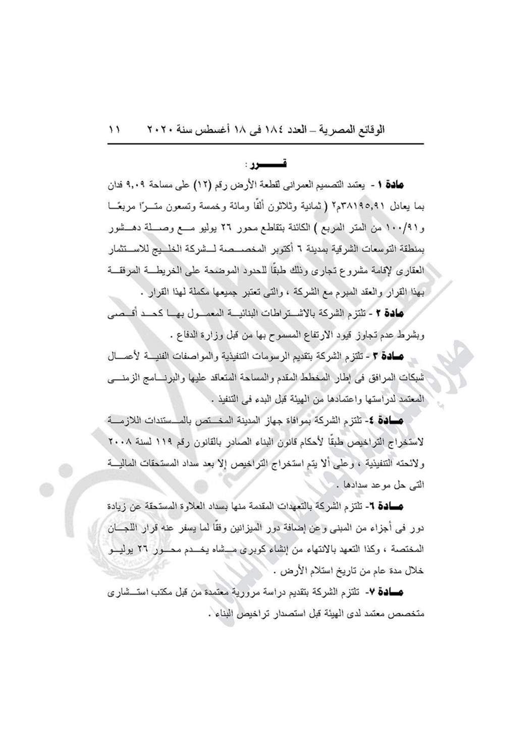 وينص القرار على اعتماد التصميم العمراني لقطعة الأرض رقم 12 على مساحة 9.09 فدان بما يعادل 38195.91 متر مربع، الكائنة بتقاطع محور 26 يوليو مع وصلة دهشور بمنطقة التوسعات الشرقية بمدينة 6 أكتوبر المخصصة لشركة الخليج للاستثمار العقاري لإقامة مشروع تجاري طبقًا للحدود الموضحة على الخريطة المرفقة بالقرار والعقد المبرم مع الشركة.