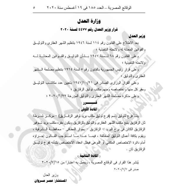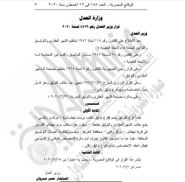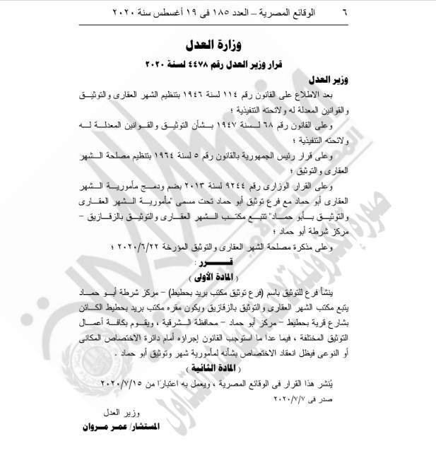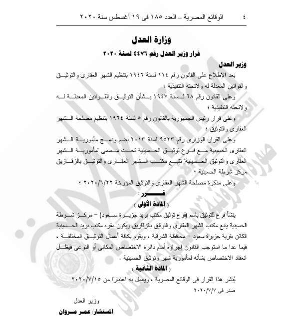 نشرت جريدة الوقائع المصرية في عددها رقم 185، الصادر في 19 أغسطس 2020، 4 قرارات لوزير العدل المستشار عمر مروان بإنشاء أفرع للتوثيق بمكاتب بريد جزيرة سعود بمركز شرطة الحسينية بالزقازيق شرقية، وبريد توفير الزقازيق بالزقازيق شرقية، و مكتب بريد بحطيط مركز شرطة أبو حماد شرقية، و مكتب بريد نهطاى بمركز زفتى بالغربية.