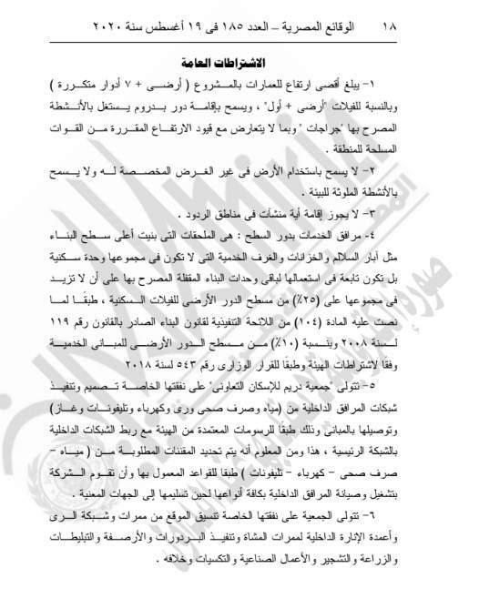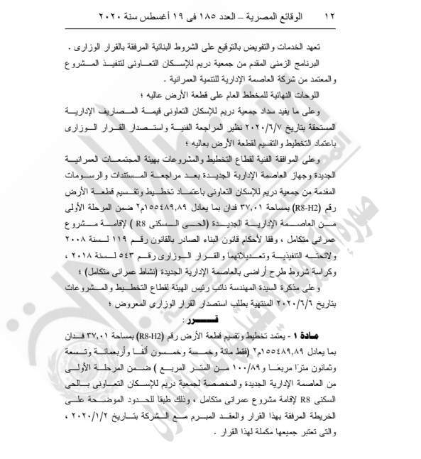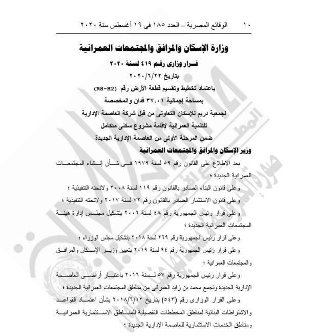 نشرت جريدة الوقائع المصرية في عددها رقم 185، الصادر في 19 أغسطس 2020، قرار وزارة الإسكان والمرافق والمجتمعات العمرانية رقم 419 لسنة 2020، بشأن اعتماد تخطيط إقامة مشروع سكني متكامل ضمن المرحلة الأولى من العاصمة الإدارية الجديدة لجمعية دريم للإسكان التعاوني.
