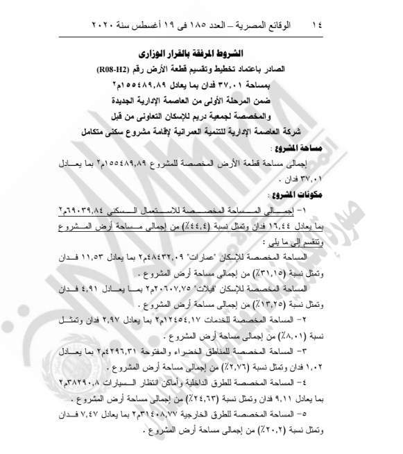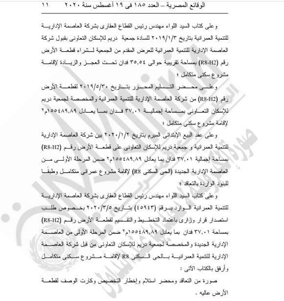 اعتماد تخطيط وتقسيم قطعة الأرض رقم (R8-H2) بمساحة إجمالية 37.01 فدان والمخصصة لجمعية دريم للإسكان التعاوني من قبل شركة العاصمة الإدارية للتنمية العمرانية لإقامة مشروع سكني متكامل ضمن المرحلة الأولى من العاصمة الإدارية الجديدة.