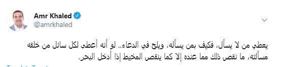 وكتب عمر خالد تغريدة على تويتر "يعطي من لا يسأل، فكيف بمن يسأله، ويلح في الدعاء.. لو أنه أعطى لكل سائل من خلقه مسألته، ما نقص ذلك مما عنده إلا كما ينقص المخيط إذا أدخل البحر"