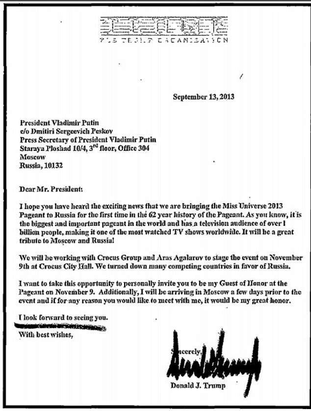 وأخبر ترامب بوتين في رسالته بتاريخ يونيو 2013 أنه سمع بالتأكيد عن أنباء إقامة مسابقة ملكة جمال الكون في روسيا.