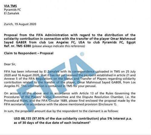 حصل مجلس إدارة الزمالك برئاسة المستشار مرتضى منصور على قرار من الاتحاد الدولي لكرة القدم فيفا بأحقية النادي في الحصول على نظير رعاية عمر جابر لاعب الفريق السابق.